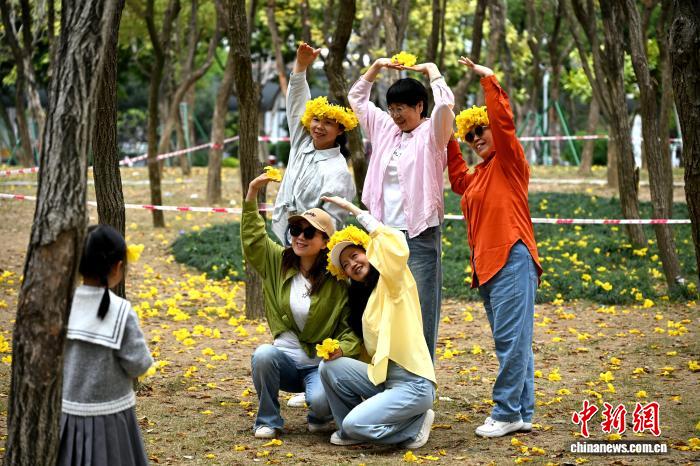 3月24日,市平易近正在祸州黄花风铃木花园内乱游历、摄影。中新社记者 吕亮 摄