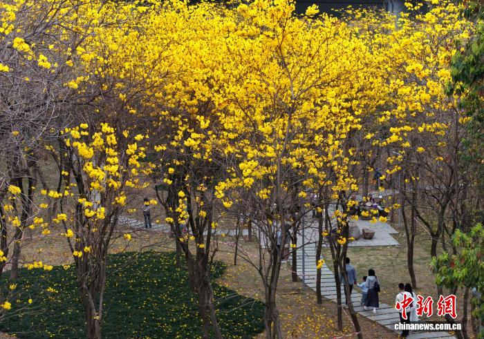 3月24日,市平易近正在祸州黄花风铃木花园内乱游历、赏花。(无人机相片)中新社记者 吕亮 摄